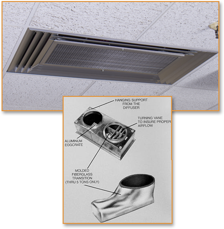 The RRS 510 Series concentric diffuser system is our flush-mount concentric diffuser, and is perfect for use in a “T-Bar” ceiling application. With the all-aluminum construction, “anti-sweat” gasketing and the industry’s only molded fiberglass transition (through 5 tons) or supply-through-return duct installed (larger models), the RRS 510 Series concentric diffuser system is the ideal solution for those applications requiring a flush-mount concentric diffuser.